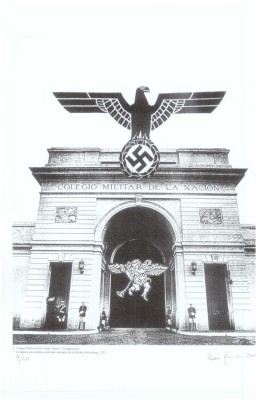 Colegio Militar ( foto Jorge Sanchez) + Insignia nazi + Trompeta apocaliptica, grabado anónimo de la biblia Wittenberg, 1535