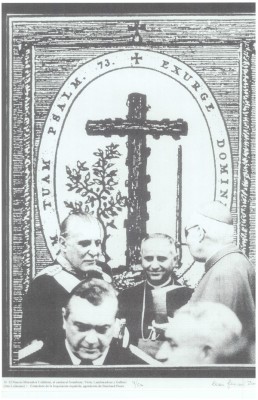 El Nuncio Monseñor Calabresi, el Cardenal Aramburu, Videla, Lambruschini y Galtieri + Estandarte de la Inquisición española aguafuerte de Bembard Picart